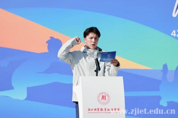数字贸易学院国际贸易232班叶慧乐、体育教研室教师任立强分别代表全体运动员和裁判员宣誓。